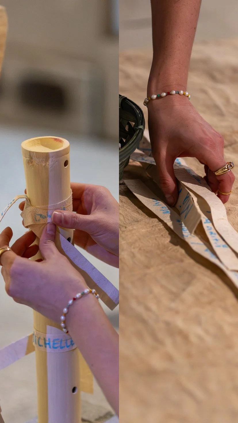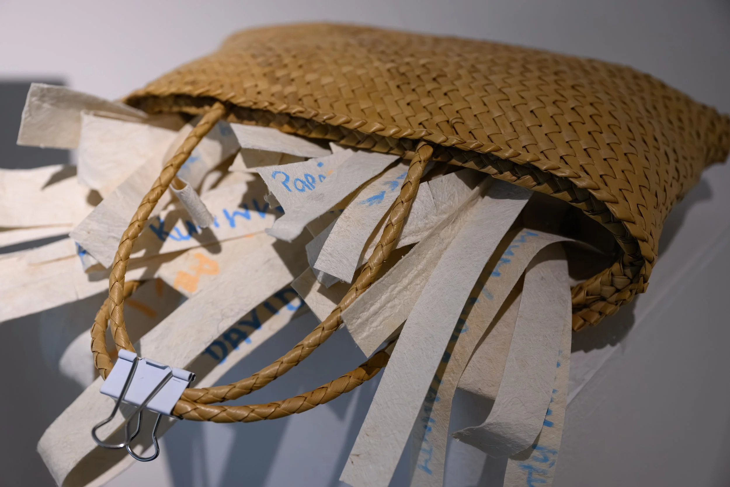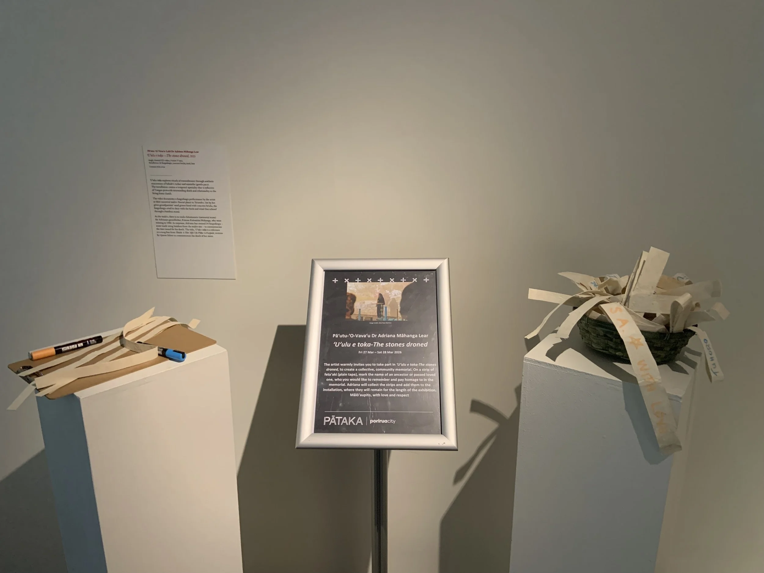 U'ulu e toka explores rituals of remembrance through a collective memorial installation. As part of the exhibition opening of Ongo: (Re)Sounding the Vā, members of the community were invited to take part in their own ritual of remembrance, by contributing to the installation by marking strips of feta’aki (plain tapa) with the names of ancestors or passed loved ones. The artist extends a heartfelt mālō ‘aupito to all those who contributed to the collective community memorial, which will be honoured by scheduled activātions throughout the exhibition program, including a special ceremony of return for the contributors - please keep an eye out on Pātaka socials.