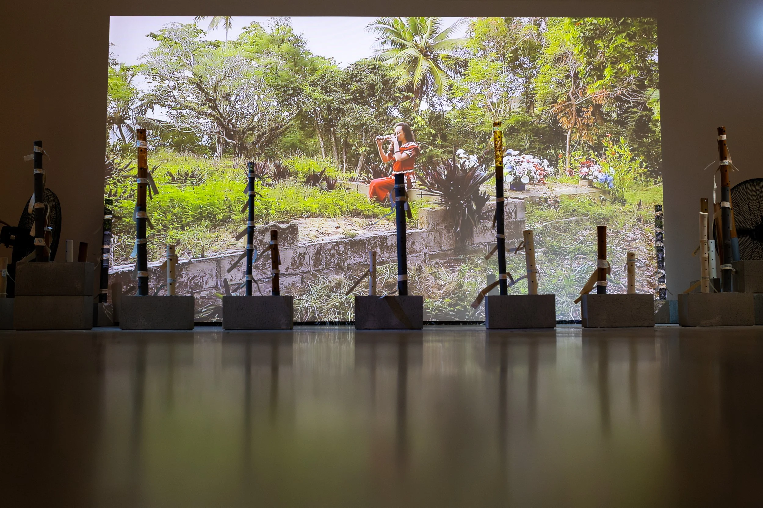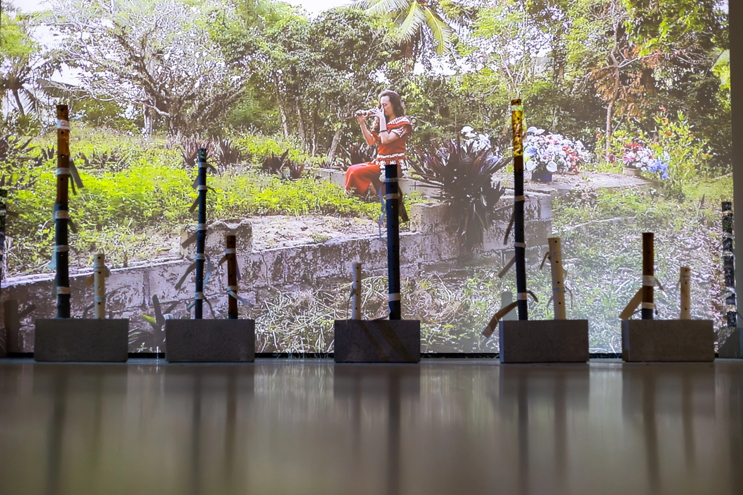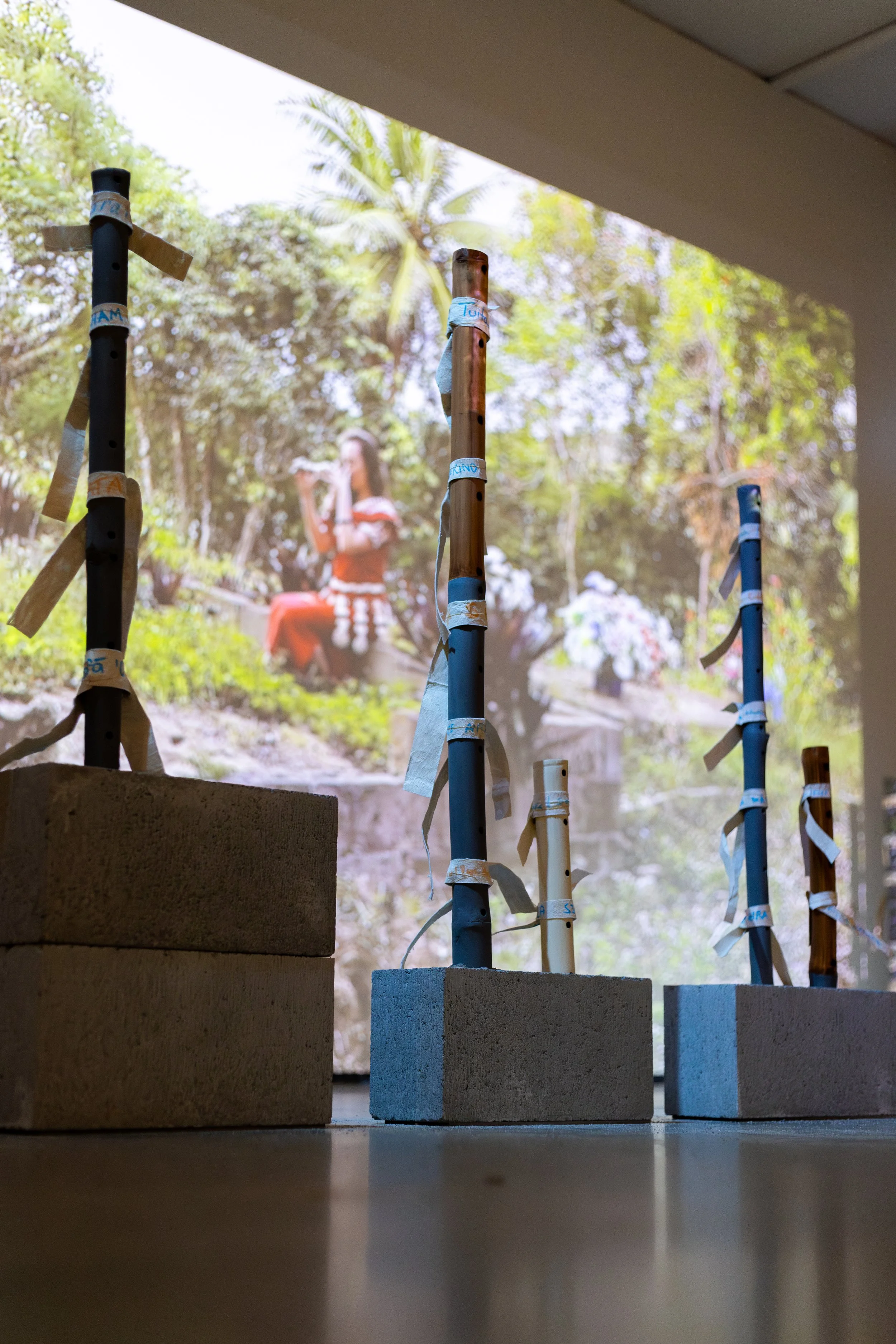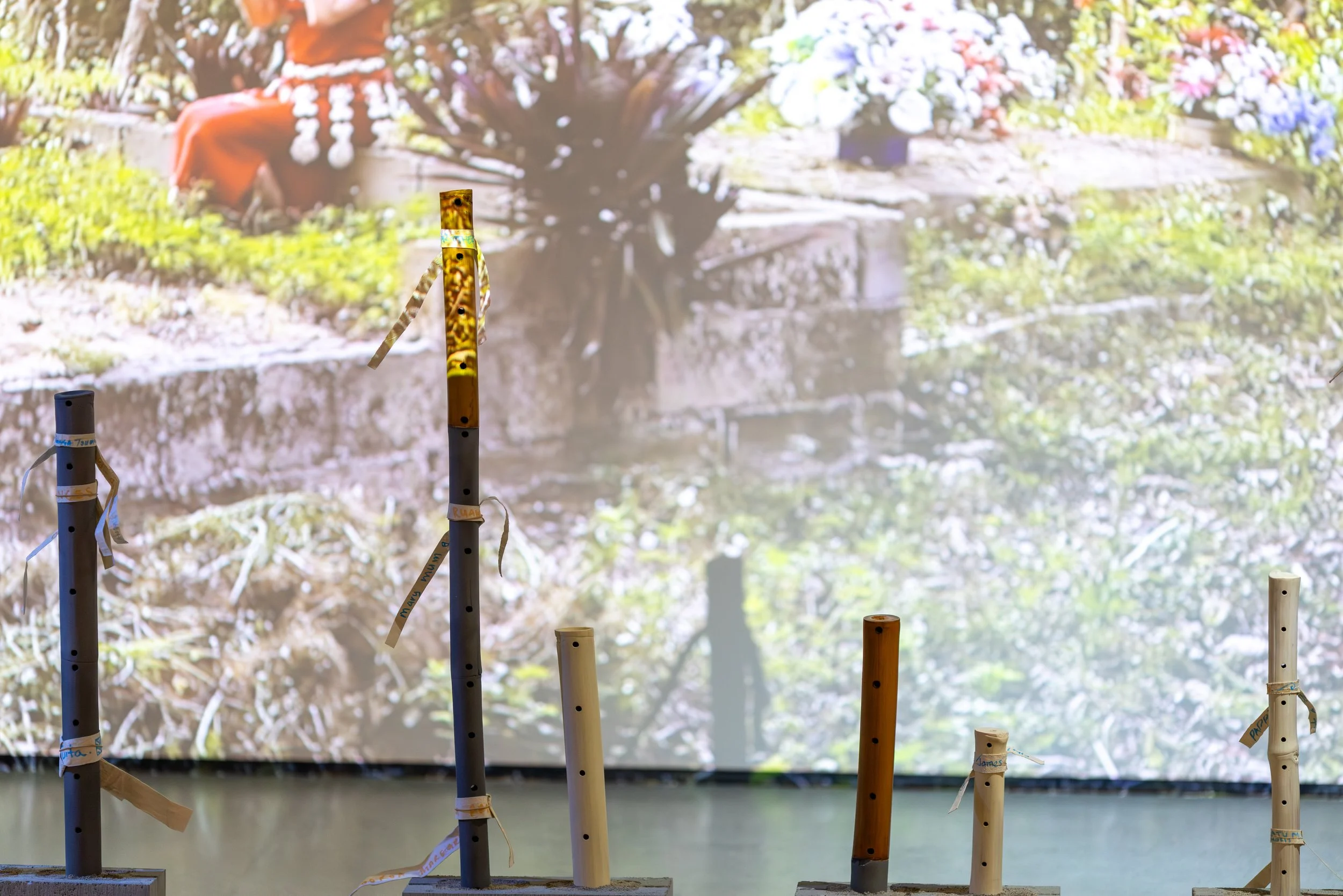 ‘U'ulu e toka explores ways in which we seek to remember and to be remembered through tangible and intangible interventions in the landscape (fonua). It engages the fangufangu (bamboo nose-flute) as a vaka (vehicle/conduit) of connection, communication and remembrance between the living on Maama (earth) and the dead in Pulotu (ancestral homeland and afterworld). The work extends the artist’s personal memorial to their Grandfather into a collective space for ancestral remembrance and recognition of shared mourning. The title, ‘U‘ulu e toka echoes a sung line from Tutulu ‘a ‘Ene ' ‘Afió ‘i he Pekia 'a Fusipalá, written by Queen Sālote to commemorate the death of her sister.
